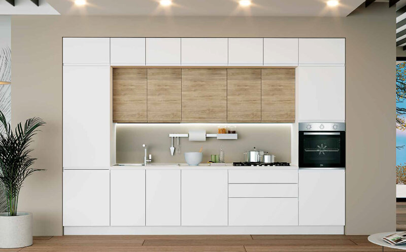 Anta in MDF, spessore 19 mm. con maniglia a gola, realizzata direttamente nel pannello.Ante e cassetti con chiusura ammortizzata.